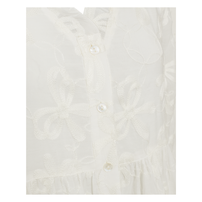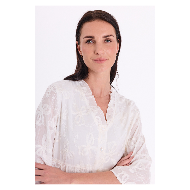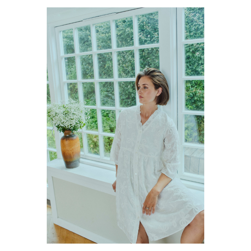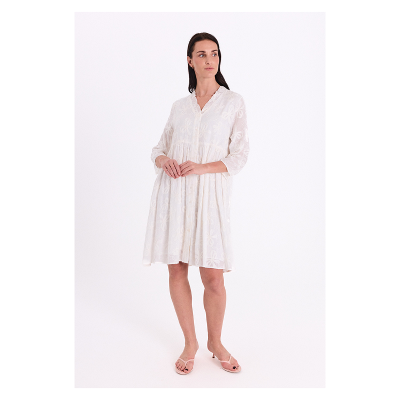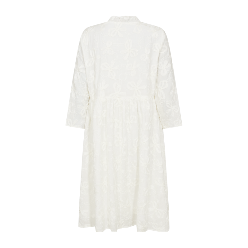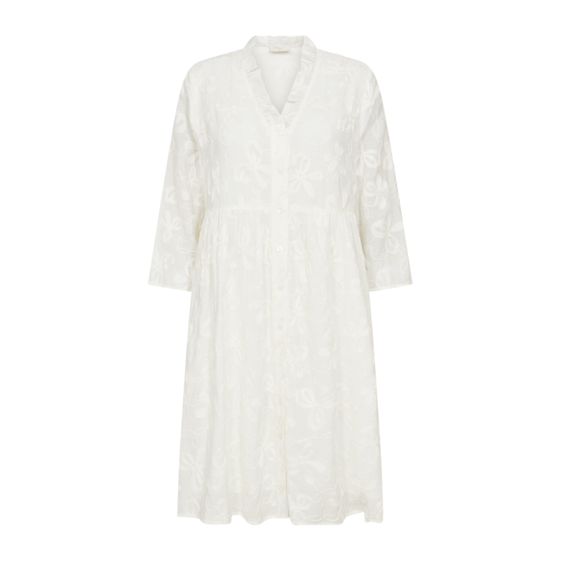 Randy kjole fra Freequent i en let kvalitet med strukturmønster. Kjolen er enkel i modellen med knaplukning langs fronten, trekvartlange ærmer, læg i skørtet samt V-udskæring med flæsekant.