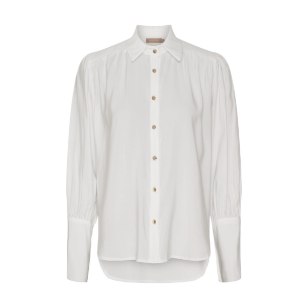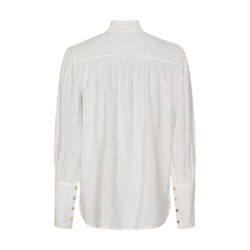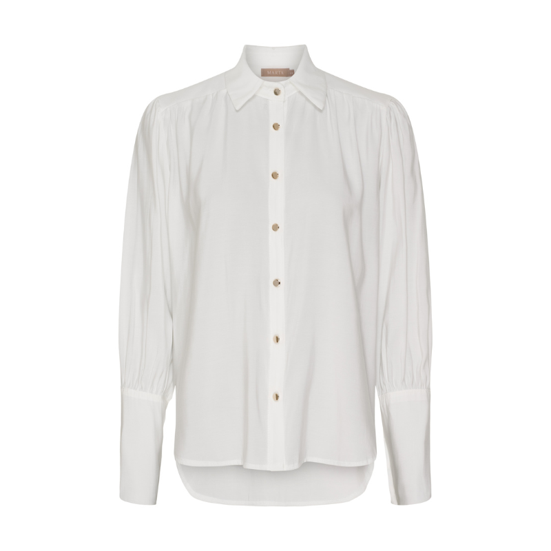 Rhea skjorte fra Marta er en fin og simpel hvid skjorte med guld knapper. Den har lange ærmer, spids krave og knaplukning foran.