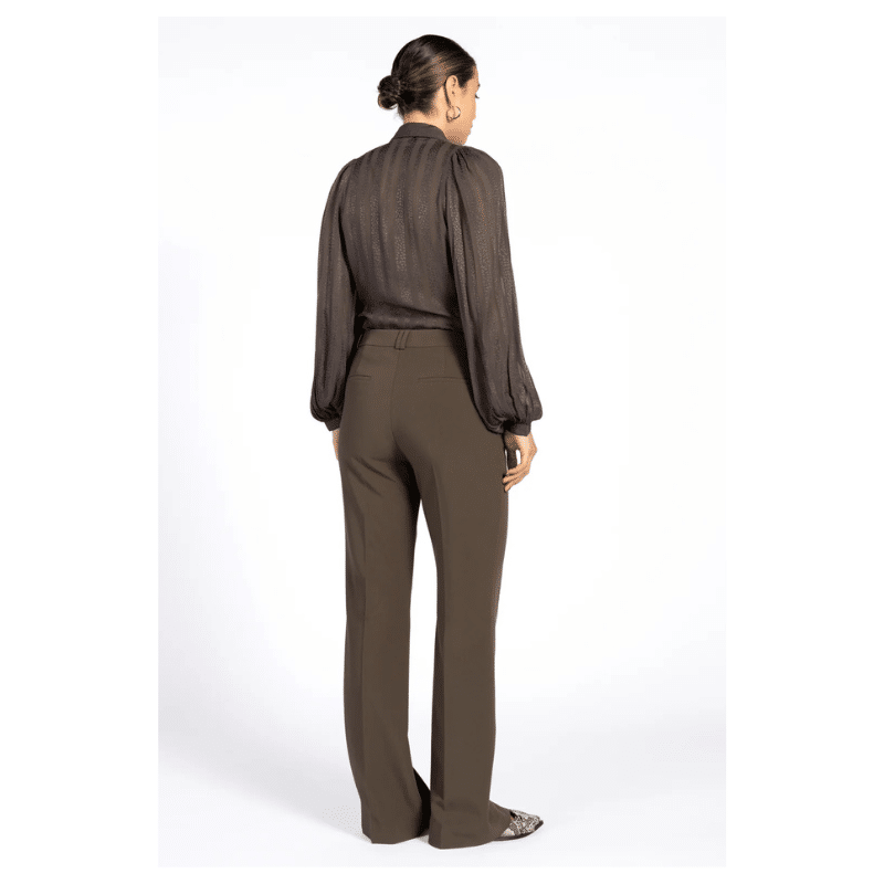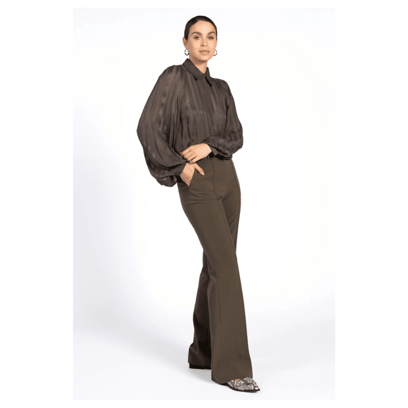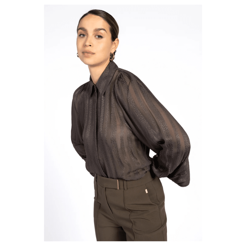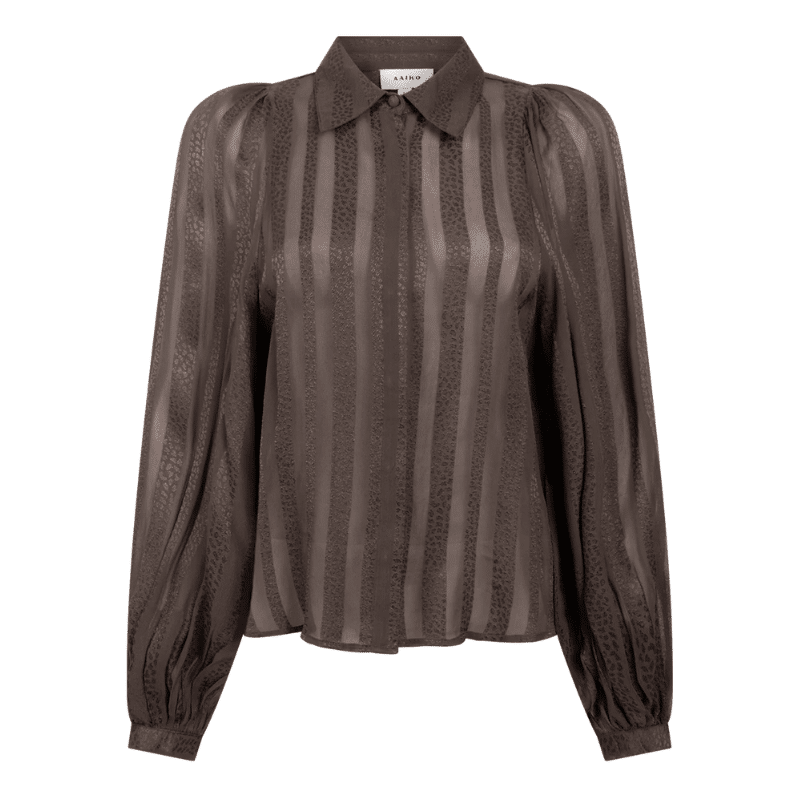 Rose stribet skjorte fra Aaiko er fremstillet af et gennemsigtigt stof med lodrette striber. Med sin klassiske krave og feminine pufærmer kan denne bluse nemt bruges både på kontoret og til en finere middag.