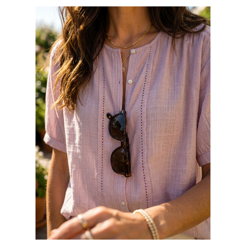 Ruth Blouse fra Prepair er en feminin og let bluse med fine, dekorative detaljer. Blusen har en rund halsudskæring og gennemgående knaplukning foran med små perlemors knapper. De lodrette stikningsdetaljer på fronten tilfører en fin detalje, mens de let rynkede skuldre og ærmer skaber en blød og flatterende silhuet. Den løse pasform gør den behagelig at have på og nem at style.