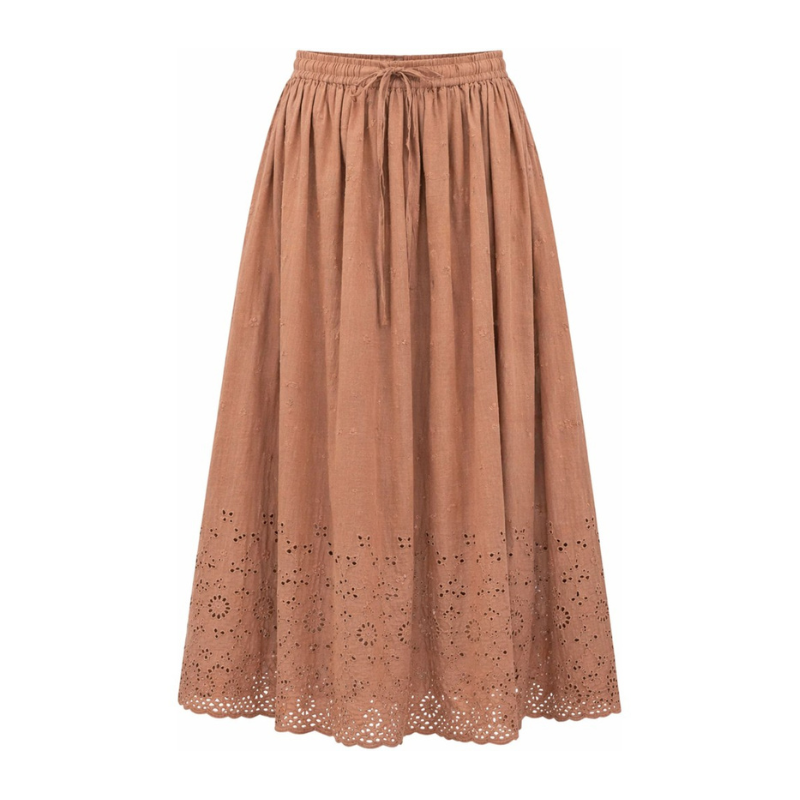 Sand nederdel fra Costa Mani. Feminin lang nederdel i blød brun kvalitet med smukt hulmønster langs kanten. Modellen har elastik talje med bindebånd, der sikrer en behagelig og fleksibel pasform. Den lette vidde og fine broderidetaljer giver et romantisk udtryk – perfekt til både hverdag og sommerens arrangementer.