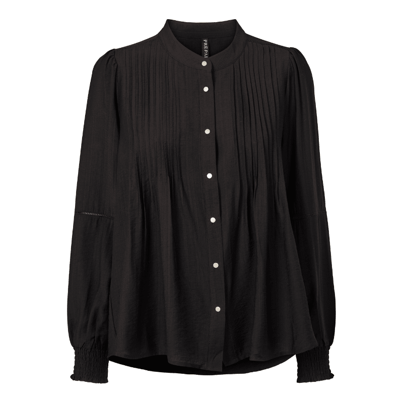 Scarlett bluse fra Prepair har fine lægdetaljer foran, som giver et feminint fald. Blusen har en gennemgående knaplukning med gyldne knapper, der tilfører et sofistikeret touch. Blusen har fine, diskrete huldetaljer over skuldrene og som en dekorativ linje på tværs af ærmerne. Ærmerne er lange med smock-elastik ved håndleddene.