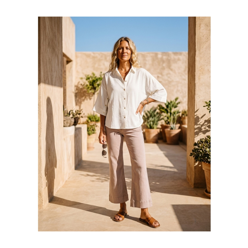 Selma bluse fra Prepair er en fin skjorte i en løs, oversized model med klassisk krave og gennemgående knaplukning foran. Skjorten har 3/4 lange og brede ærmer med ombuk og knapdetaljer langs siden, som giver mulighed for at justere udtrykket.