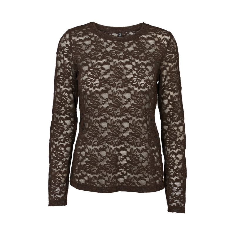 Stella blonde bluse fra Prepair er en langærmet blondebluse i en mørk brun nuance. Den er fremstillet i et gennemsigtigt blondemateriale med et elegant blomsterinspireret mønster, som giver et feminint og sofistikeret udtryk. Blusen har en rund halsudskæring og en tætsiddende pasform, der fremhæver silhuetten.