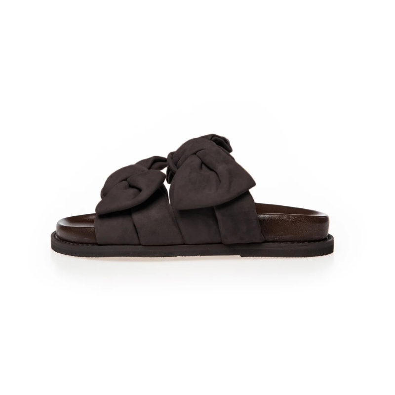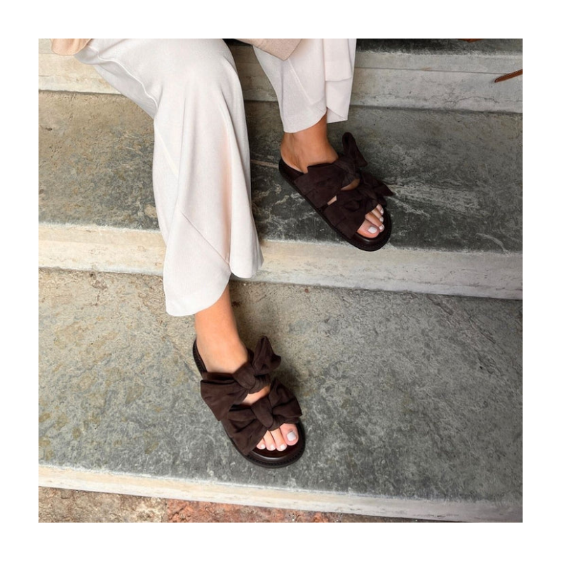 Smukke sandaler i blødt ruskind, med to store dekorative sløjfer. Indersålen er i skind og foret med en speciel Copenhagen Shoes latex sål, der er dejlig blød at gå på. Lette og flexible ydersåler i EVA.