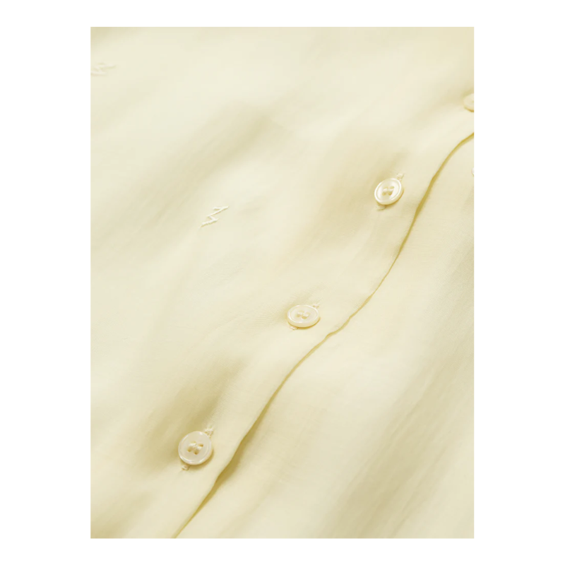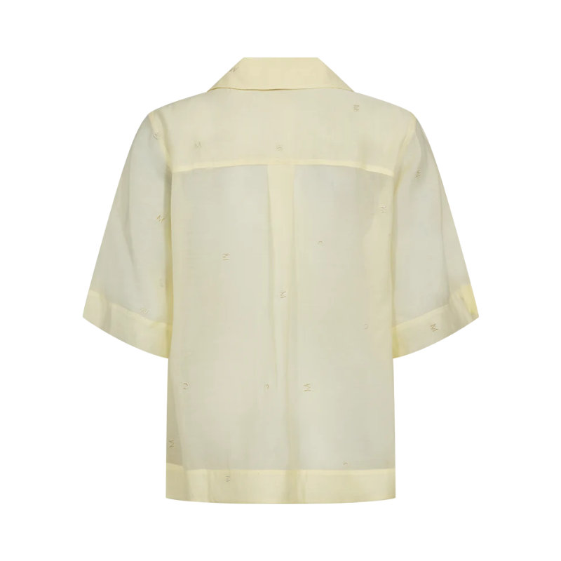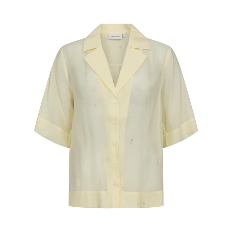 Tilly skjorte fra Copenhagen Muse er en kortærmet gennemknappet skjorte i en let gennemsigtig lyocelblanding. Den afslappede, boxy silhuet har klassiske revers-krave-balanceret af de brede ærmer. Fint tone-i-tone monogrambroderi pryder krop og ærmer.