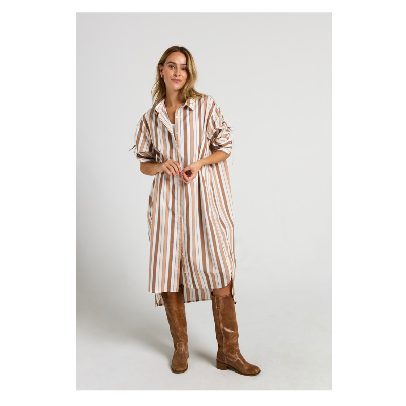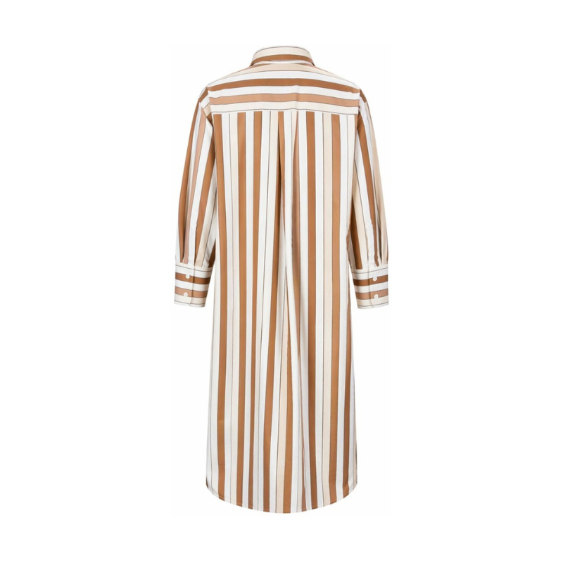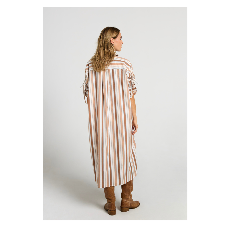 Elegant skjortekjole i let og behagelig kvalitet med klassiske, striber. Modellen har krave, gennemgående knaplukning og lange ærmer der kan bindes op, samt manchetter. Den løse pasform og afrundede kant giver et afslappet, men stilrent look – perfekt både alene som kjole eller stylet over bukser.