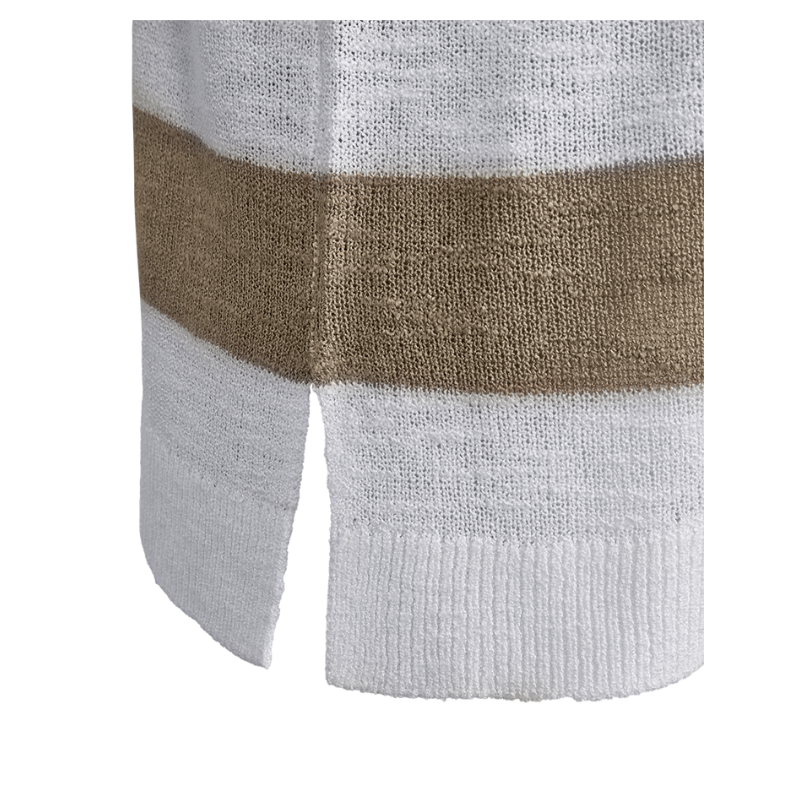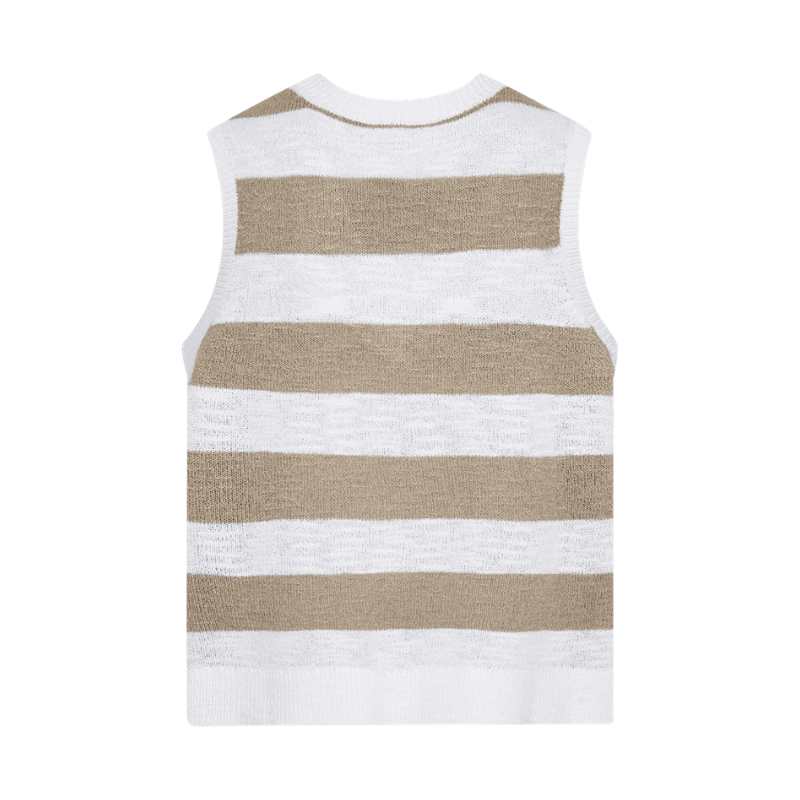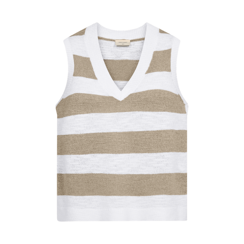 Vicki vest fra Freequent i en blød kvalitet med brune og hvide striber. En lækker vest med v-hals og uden ærmer. Perfekt alene eller udover en bluse. Fås også i hvid/sand.
