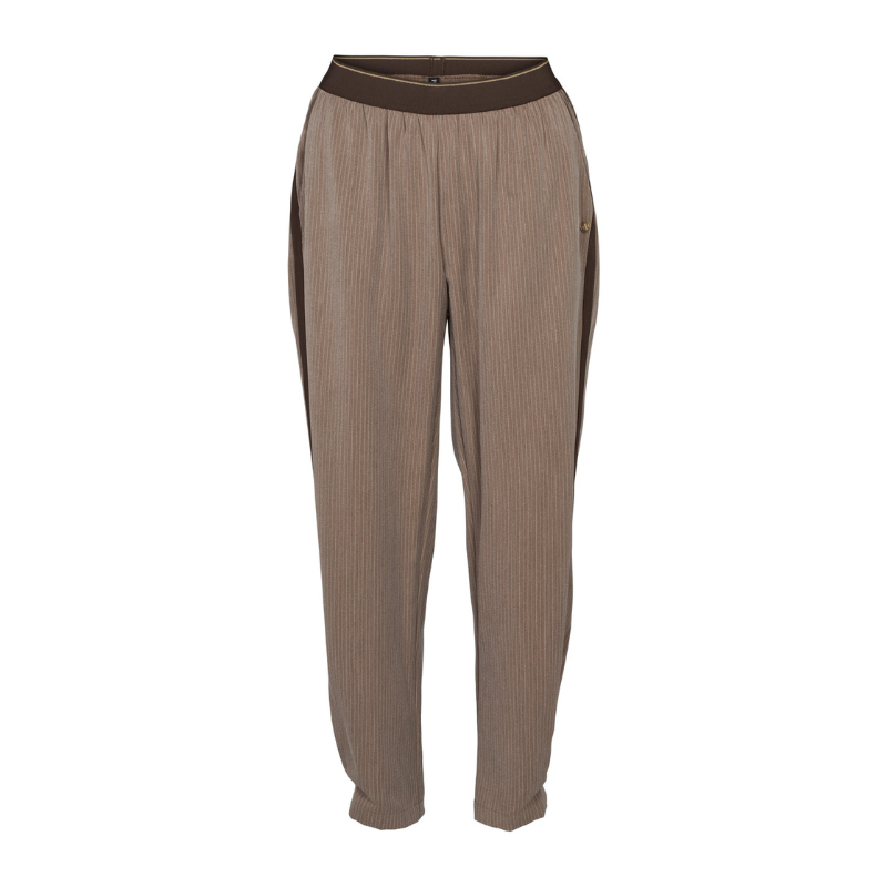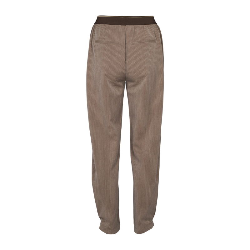 Violet bukser fra Prepair er et par afslappede og stilrene bukser med et elegant, nålestribet udtryk. De har en komfortabel pasform med elastisk linning. Bukserne er designet med diskrete sidelommer samt pyntelommer bagpå. Den mørkere kontraststribe langs ydersiden af benene giver et moderne og sporty element. Benene er lige med et let tilspidset fald.