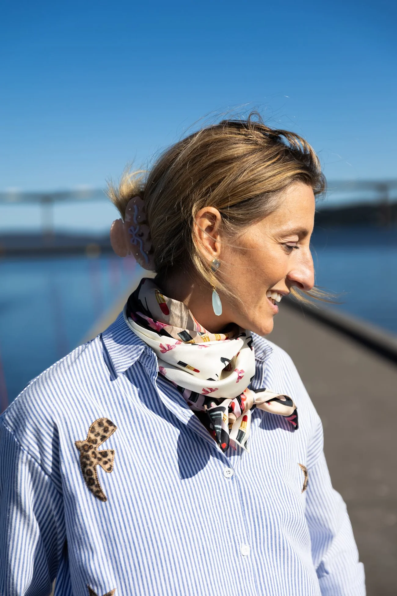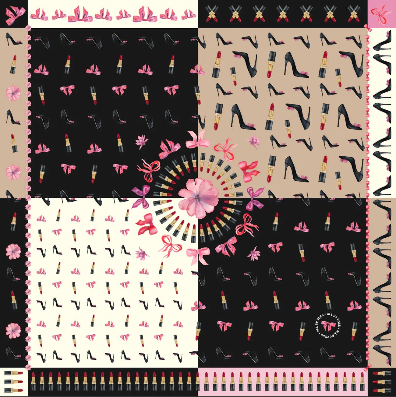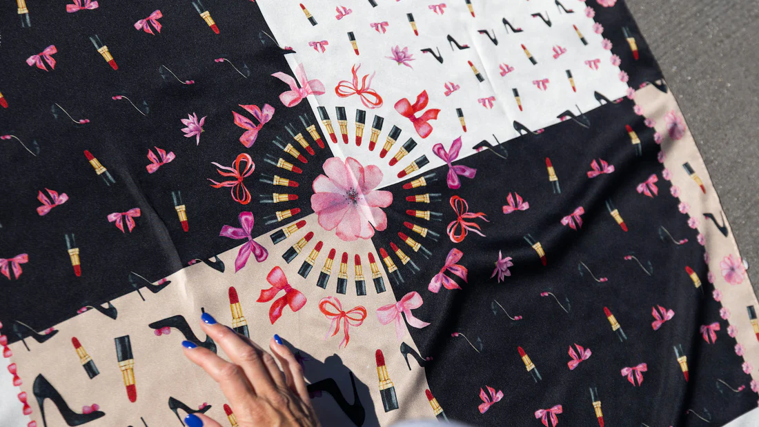 All by Voss silketørklæde Lipstick. Tørklædet består af det smukkeste farvemiks af creme, beige, lyserøde og sort/hvide detaljer. Tørklædet er super anvendeligt og elegant.