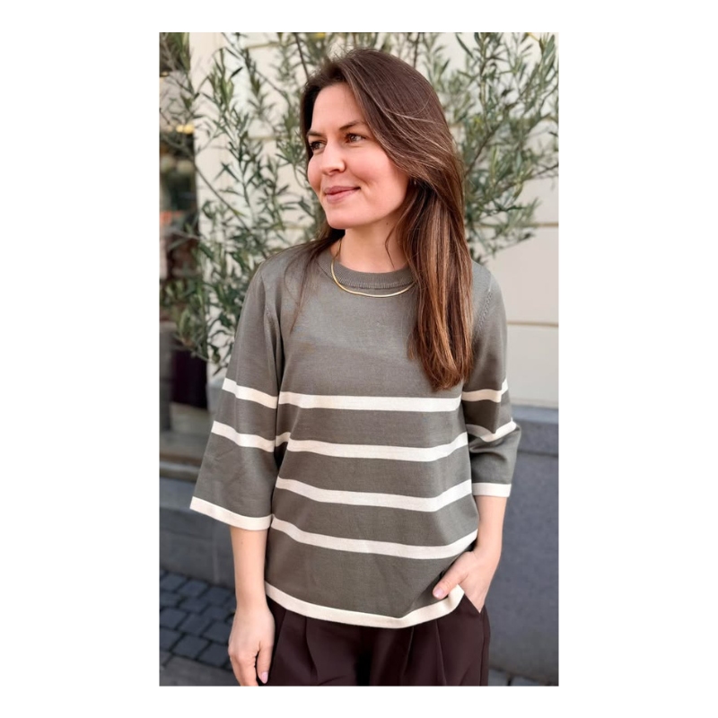En fin og klassisk strikket bluse med vandrette striber. Den har rundhals, 3/4 lange ærmer og en normal pasform. Fås også i navy og lyseblå.