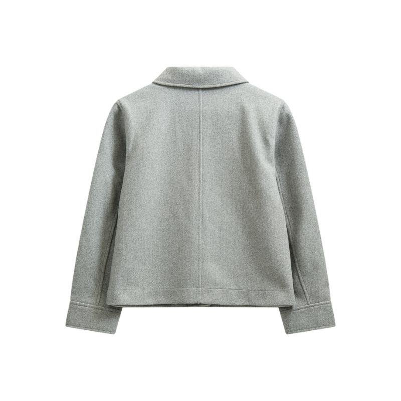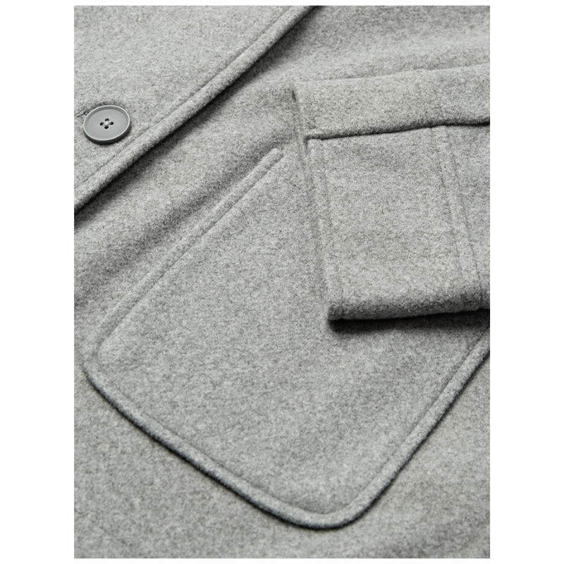 Jakken har klassisk krave, lange ærmer, knaplukning og to lommer foran. Fås også i beige.