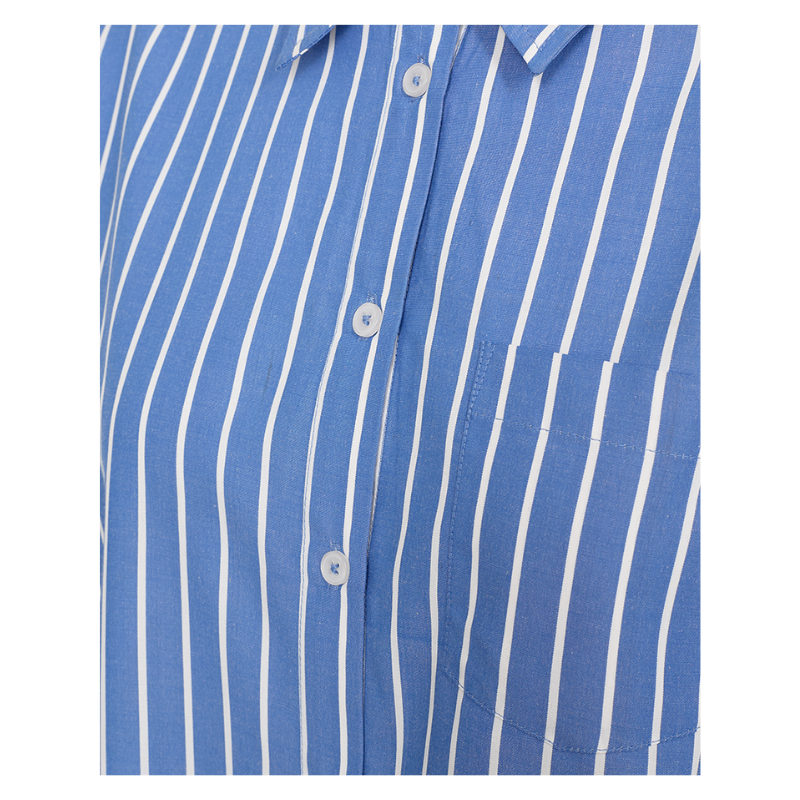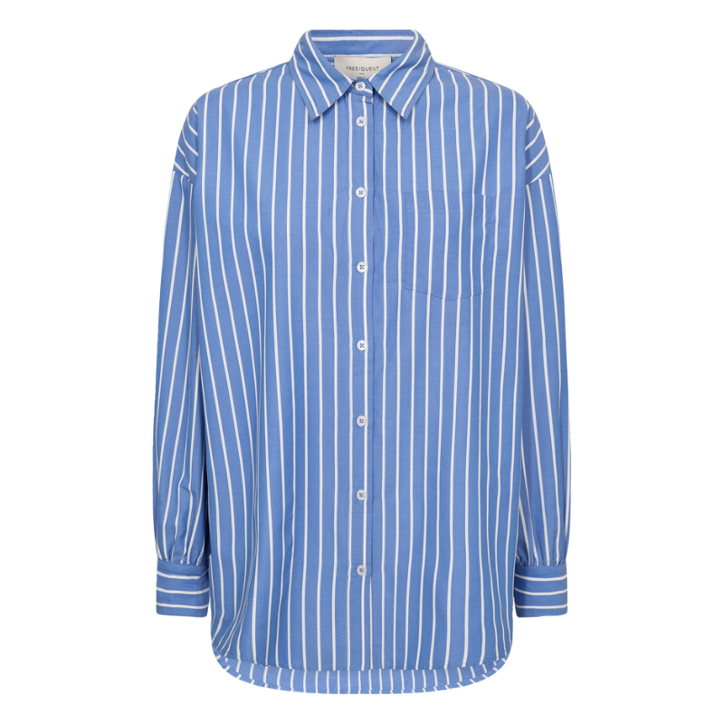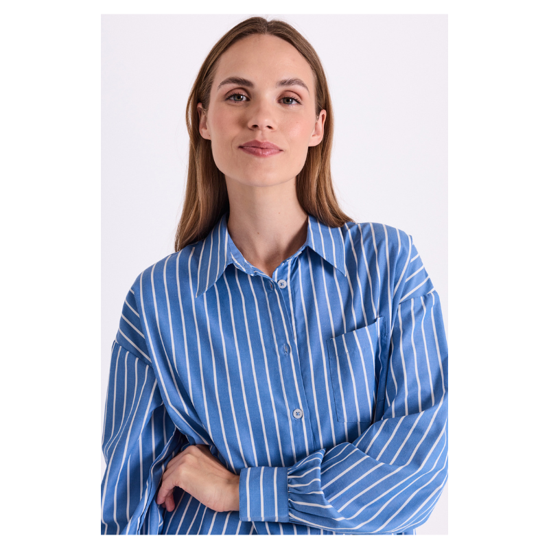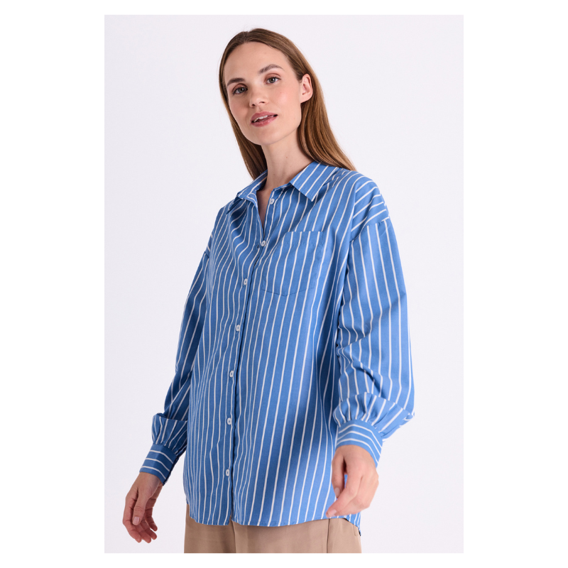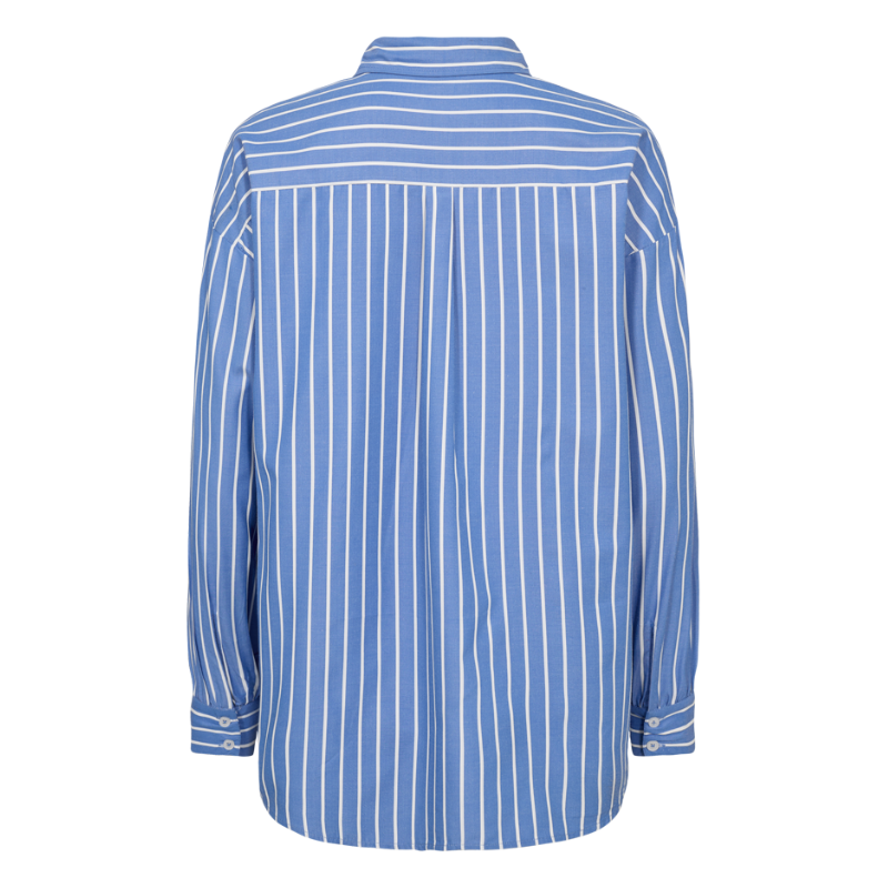 Zappa skjorte fra Freequent i en let vævet kvalitet med et sprødt udtryk og et klassisk stribet mønster. Silhuetten har en løs, lige pasform med dropped shoulders, der giver et afslappet look. Modellen har en klassisk skjortekrave og gennemknappet front, mens de lange ærmer er afsluttet med manchetter og knaplukning. Et læg i ryggen tilfører let vidde.