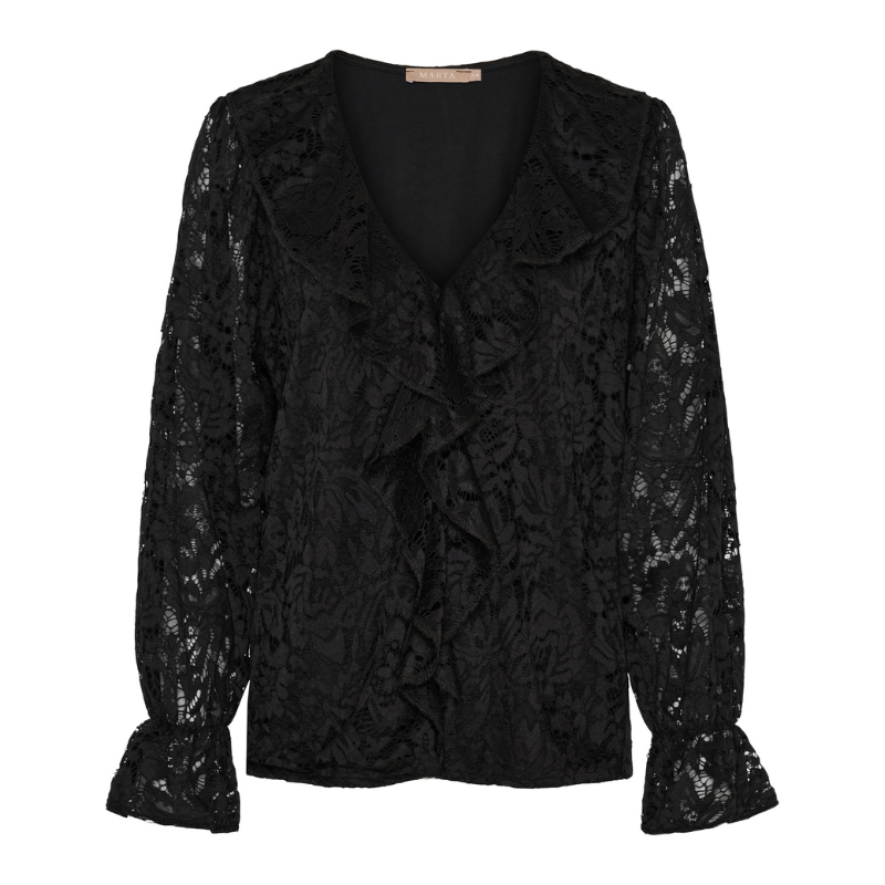 Zara bluse fra Marta er en smuk blonde bluse med fine detaljer. Blusen har lange ærmer med elastik for enden og en flæsekant langs V-udskæringen. Fås også i brun.